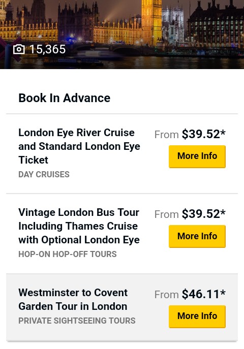 Tourist attractions include Big Ben, Buckingham Palace, The Tower of London, Coca Cola London Eye and Tower Bridge.