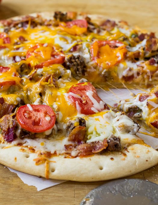 A fun, easy pizza that combines two favorite foods- pizza and cheeseburgers. Bacon, ground beef, dill pickles, tomatoes, and a special sauce give this pizza tons of flavor.