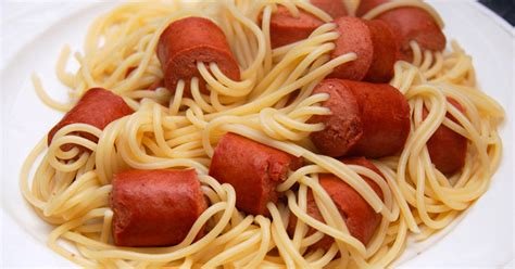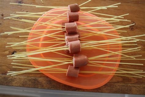 - Set a large pot of water to boil.Carefully thread 5-7 spaghetti strands through each hot dog piece. Cook until pasta is al dente, about 6 minutes.